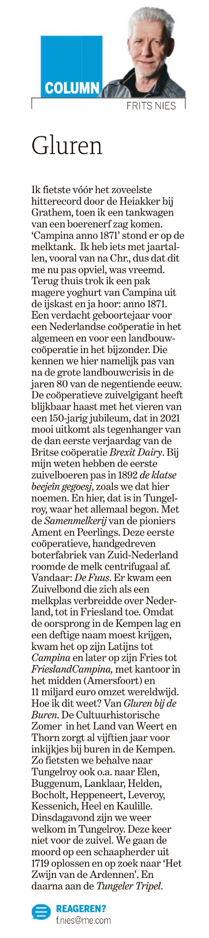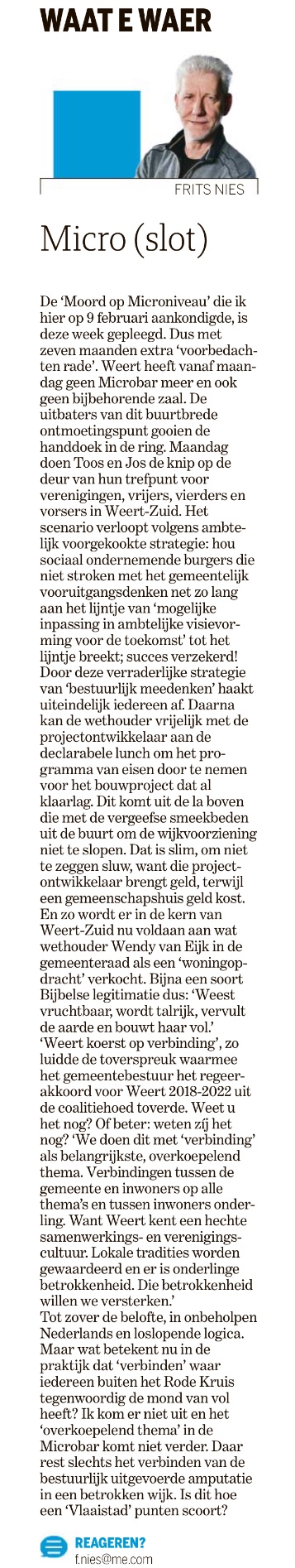 Ik moet eerlijk toegeven dat die 2 miljoen toen niet helemaal zijn gehaald; niet iedereen in Limburg kon BBC2 vinden waarschijnlijk. Maar er kwam wel iets anders los. We gingen de Maas bedwingen met Maaswerken (Maasroute, Zandmaas, Grensmaas). Alles om het aanzwellend regenwater snel van Maastricht naar Rotterdam te krijgen (zoals het Eurovisie Songfestival) en de Limburgse voeten droog te houden. Ook moesten eerder gekanaliseerde wateren zoals de Tungelroysebeek weer gaan meanderen. Kortom, megaveel miljoen euro om van het water af te komen. De werken zijn nog niet droog of we moeten van Waterschap Limburg het water alweer vasthouden. Geen zandzakken erlangs, maar erin! Jawel. Voortschrijdend inzicht versus doorstromend water. Hallo, waterschap, het regent. Wat nu, pappen of nathouden?