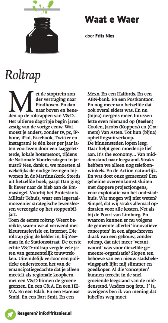 #Column in #DeLimburger over #V&D en #Weert 24/01/2015 Frits NiesEen reactie plaatsen Dit delen:Delen E-mail een link naar een vriend (Opent in een nieuw venster) E-mail Delen op WhatsApp (Opent in een nieuw venster) WhatsApp Vind-ik-leuk Aan het laden...