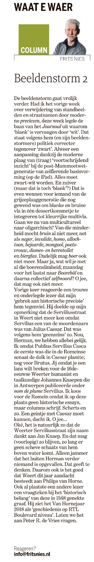 #Blanke #beeldenstorm #boorebâl – #column in De #Limburger 27/01/2018 Frits NiesEen reactie plaatsen Dit delen:Delen E-mail een link naar een vriend (Opent in een nieuw venster) E-mail Delen op WhatsApp (Opent in een nieuw venster) WhatsApp Vind-ik-leuk Aan het laden...