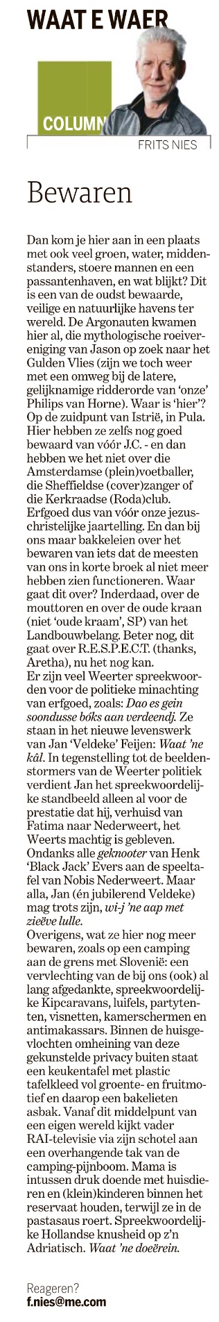 Bewaren of beschrijven? #Column in De #Limburger 08/09/2018 Frits NiesEen reactie plaatsen Dit delen:Delen E-mail een link naar een vriend (Opent in een nieuw venster) E-mail Delen op WhatsApp (Opent in een nieuw venster) WhatsApp Vind-ik-leuk Aan het laden...