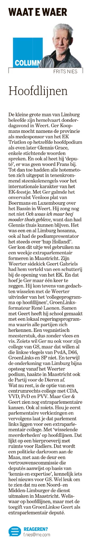 Ger, Geert & Glennis – #column in De #Limburger 01/06/201901/06/2019 Frits NiesEen reactie plaatsen Dit delen:Delen E-mail een link naar een vriend (Opent in een nieuw venster) E-mail Delen op WhatsApp (Opent in een nieuw venster) WhatsApp Vind-ik-leuk Aan het laden...
